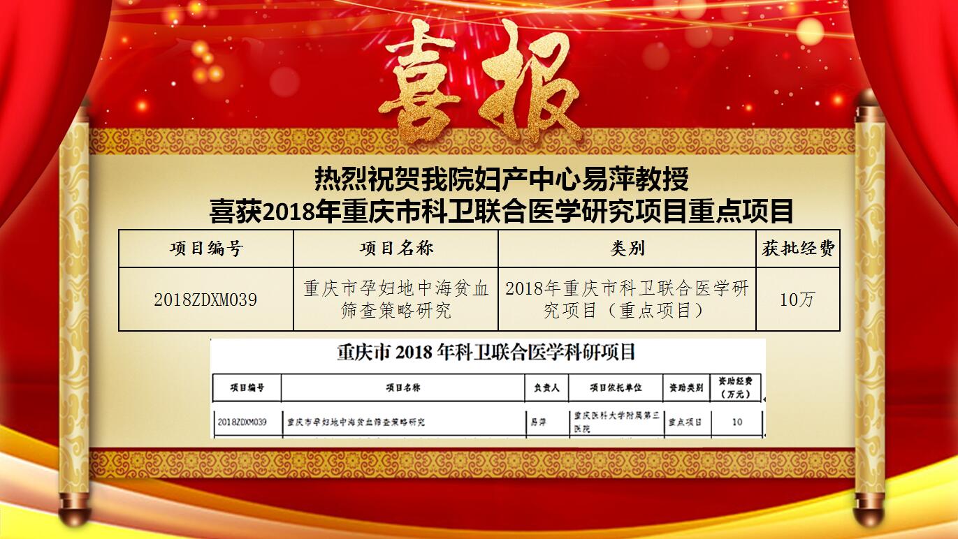 【喜讯】我院妇产中心易萍教授喜获2018年重庆市科卫联合医学研究项目重点项目
