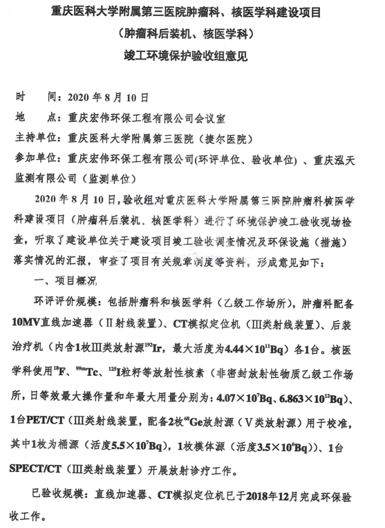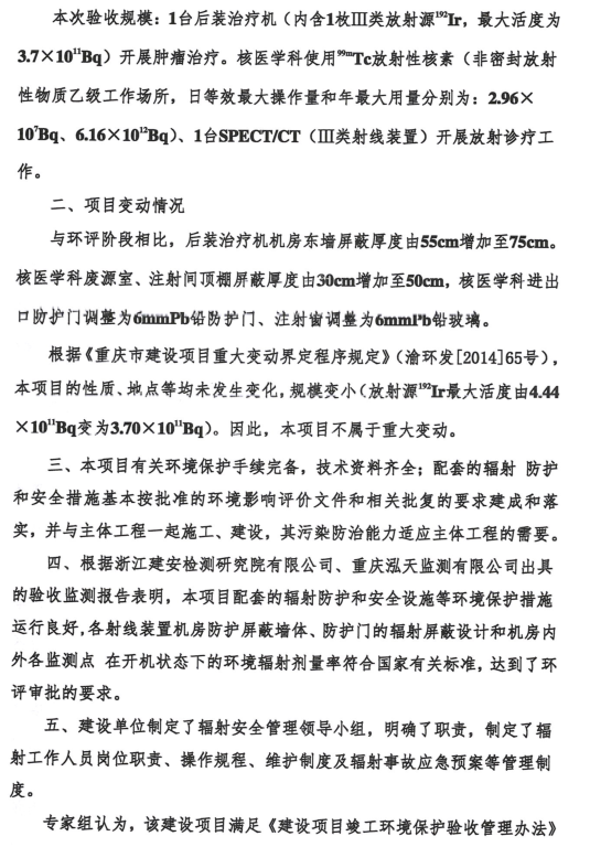 重医大附三院肿瘤科、核医学科建设项目竣工环境保护验收组意见