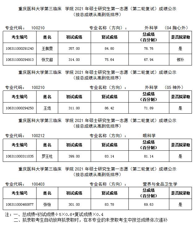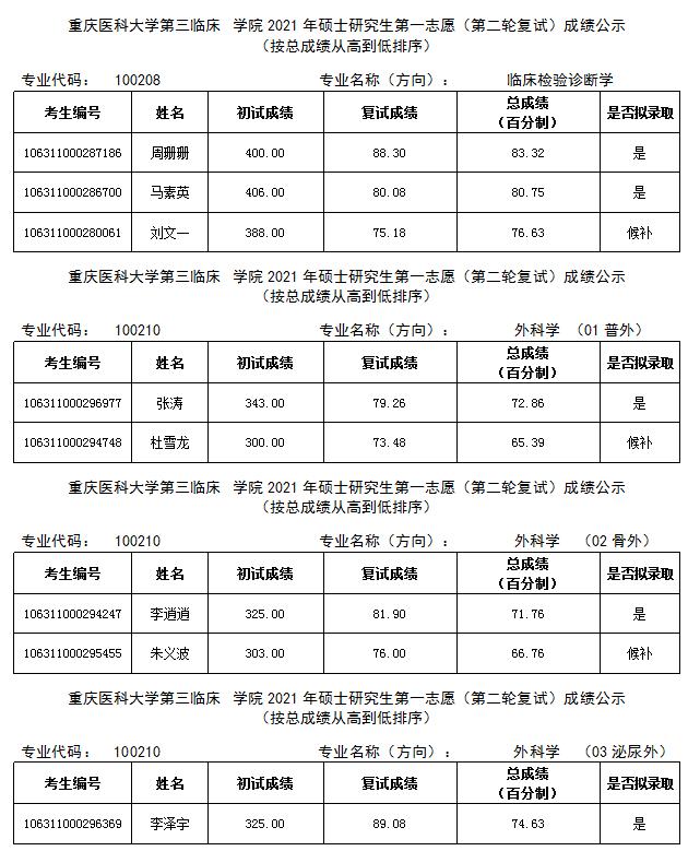 重庆医科大学第三临床学院2021年硕士研究生第二轮招生复试结果公示