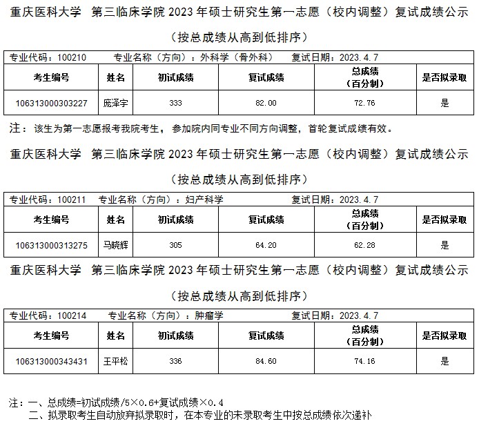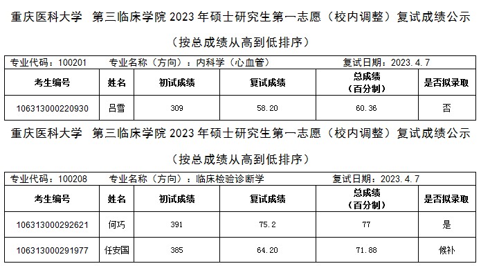 重庆医科大学第三临床学院2023年硕士研究生校内调整考生招生复试结果公示