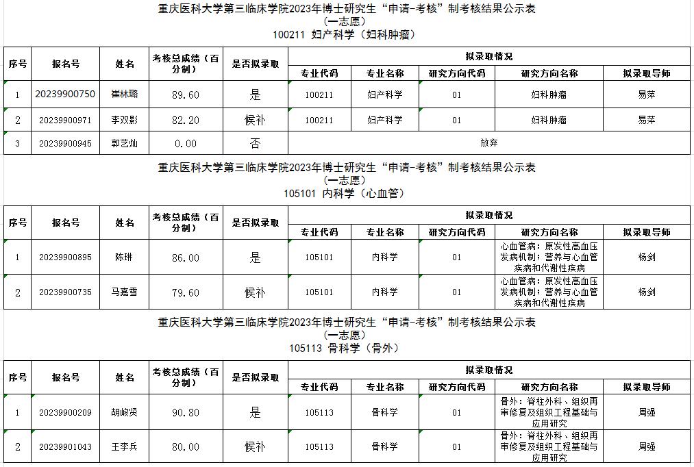 现将妇产科学(100211学术学位)、内科学-心血管(105101专业学位)、骨科学(105113骨科学学位)、妇产科学(105115专业学位)、临床检验诊断学(105120专业学位)、超声医学(105124专业学位)等专业考生的综合考核总成绩及拟录取名单进行公示,公示时间为5个工作日。如考生对考核结果有异议,请在公示期内以书面形式实名制向重庆医科大学第三临床学院科教部或重庆医科大学附属第三医院纪检审计部反映。
