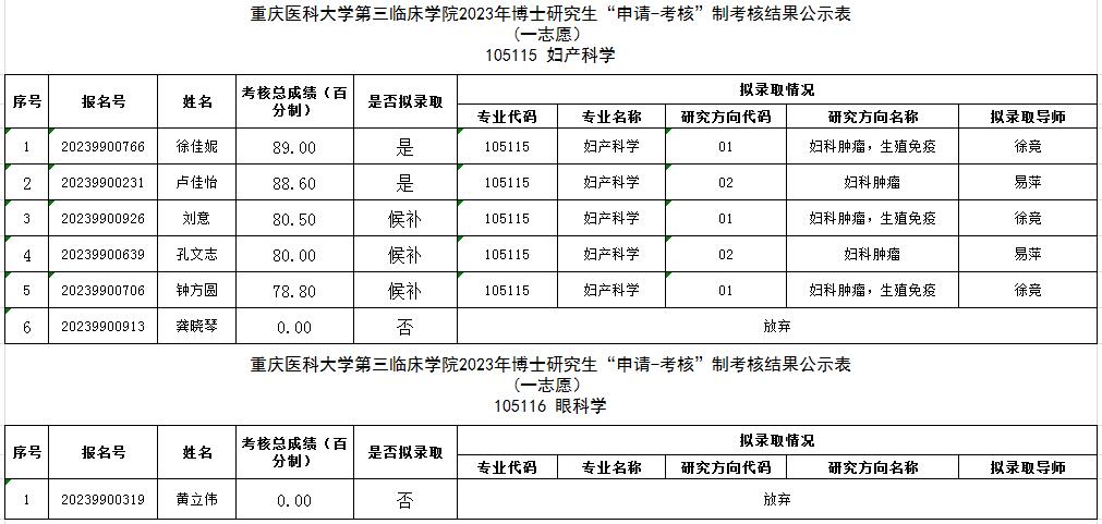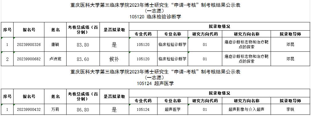 重庆医科大学第三临床学院2023年博士研究生“申请-考核”制综合考核结果公示(一志愿)