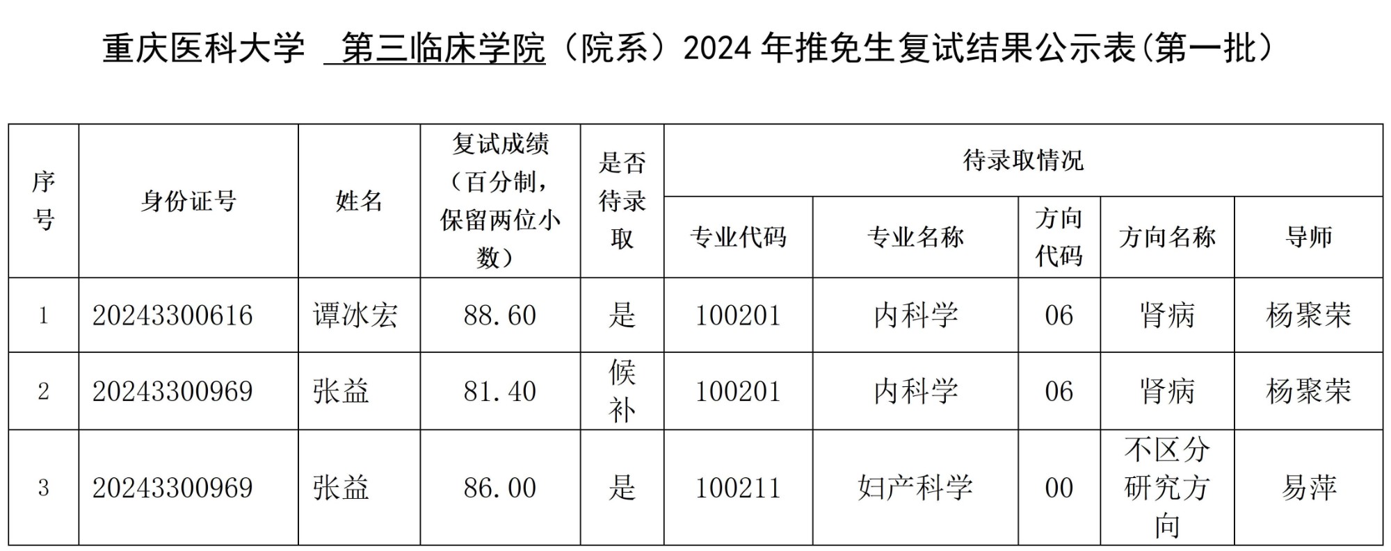 重庆医科大学第三临床学院2024年推免生第一批复试结果公示