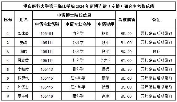 重庆医科大学第三临床学院2024年硕博连读候选生考核结果公示