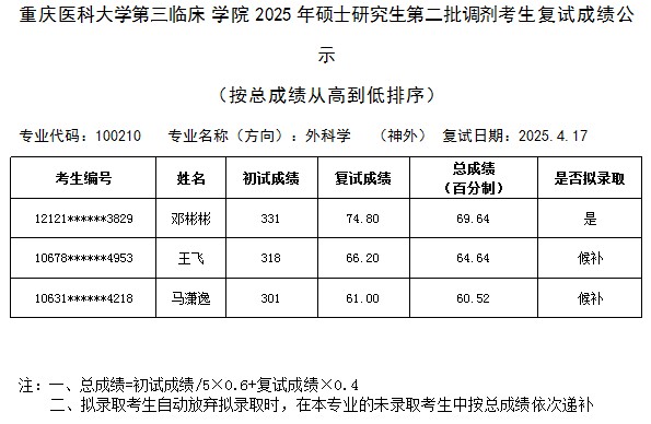 重庆医科大学第三临床学院2025年硕士研究生第二批调剂考生招生复试结果公示