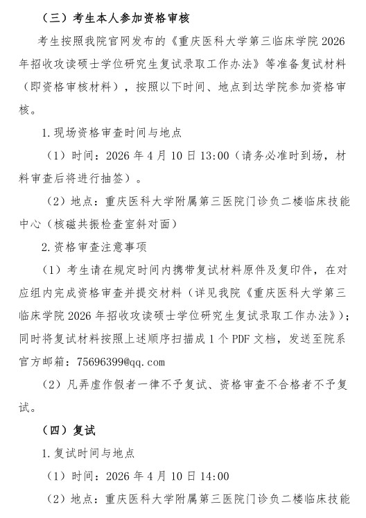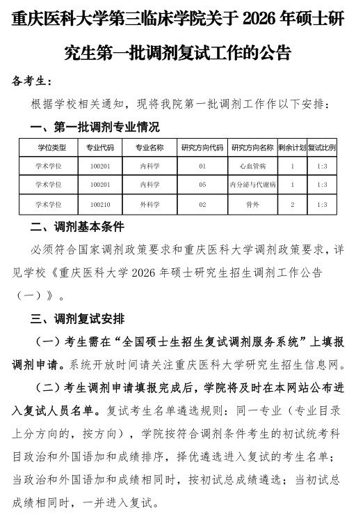 重庆医科大学第三临床学院关于2026年硕士研究生第一批调剂复试工作的公告
