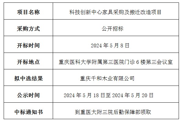 重医大附三院科技创新中心家具采购及搬迁改造项目中标结果公示