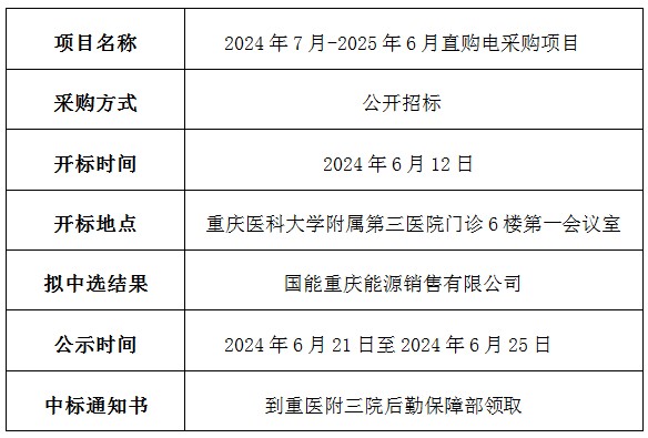重医大附三院2024年7月-2025年6月直购电采购项目中标结果公示