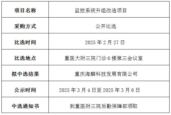 重医大附三院(方大医院)监控系统升组改造项目中选结果公示