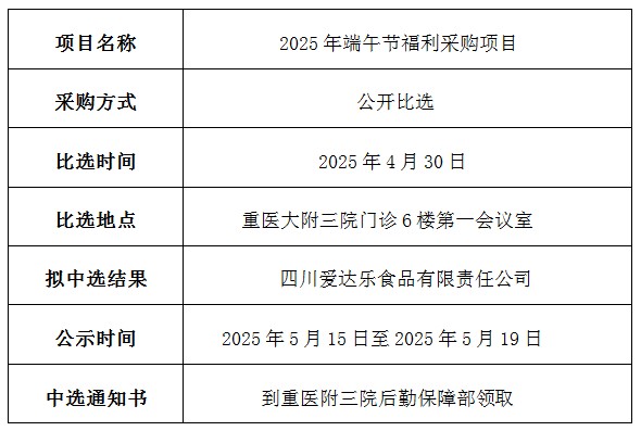 重医大附三院(方大医院)2025年端午节福利采购项目中选结果公示
