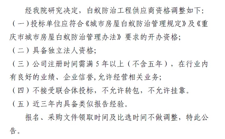 重医大附三院(方大医院)扩建及二期项目白蚁防治工程公开比选补充公告