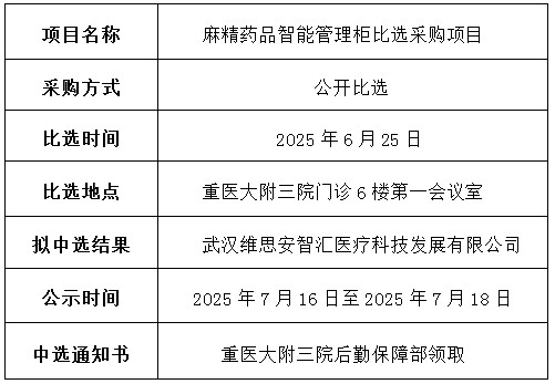 重医大附三院 (方大医院)麻精药品智能管理柜项目中选结果公示