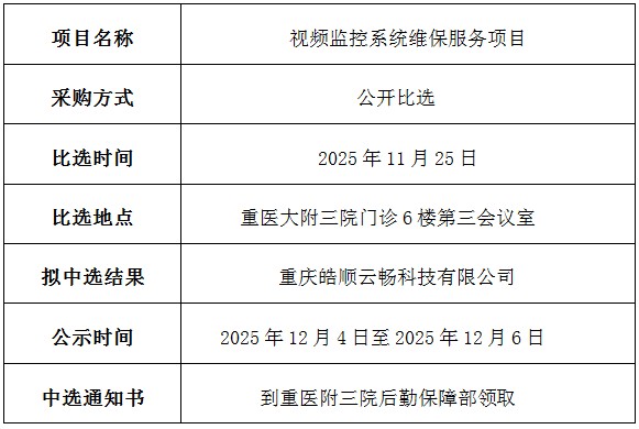 重医大附三院(方大医院)视频监控系统维保服务项目中选结果公示