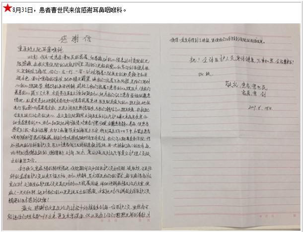 患者曹世民的感谢信