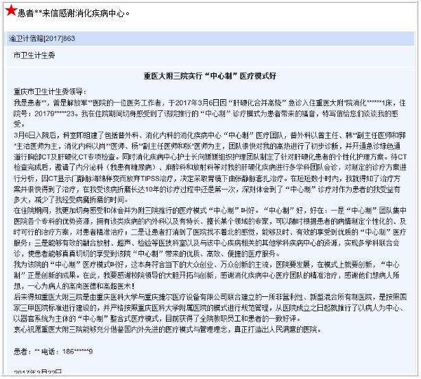 患者**的感谢信-感谢信-患者心声-患者服务-重庆医科大学附属第三医院【官方网站】