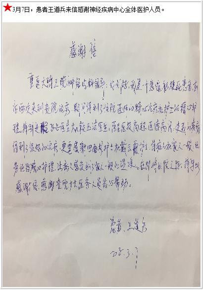 患者王道兵的感谢信