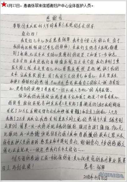 患者张翠的感谢信-感谢信-患者心声-患者服务-重庆医科大学附属第三医院【官方网站】