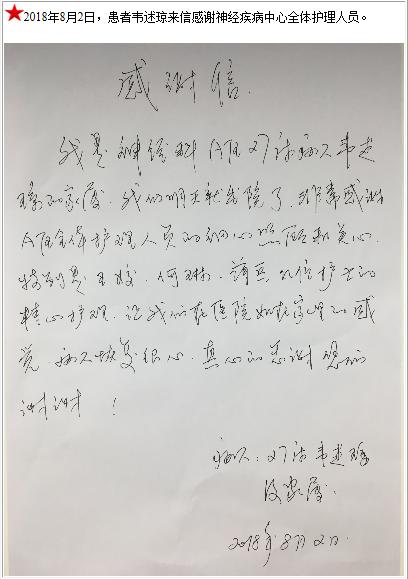 患者韦述琼的感谢信