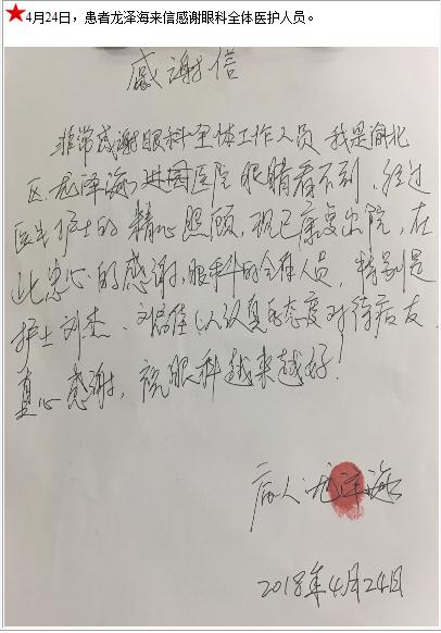 患者龙泽海的感谢信