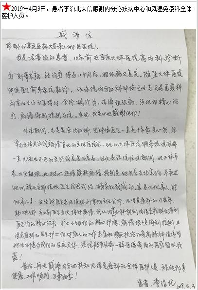 患者李治北的感谢信