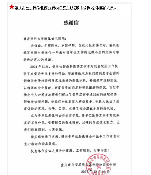 重庆市公安局渝北区分局物证鉴定所的感谢信。-感谢信-患者心声-患者服务-重庆医科大学附属第三医院【官方网站】