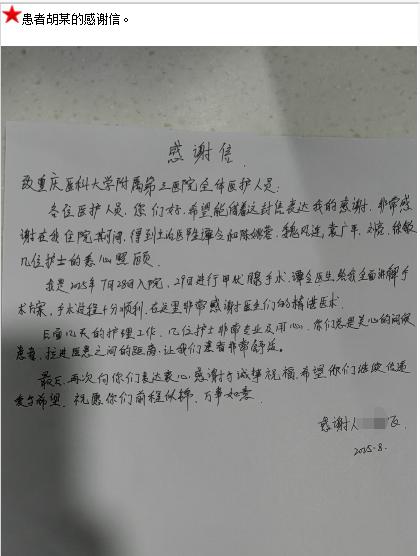 患者胡某的感谢信。-感谢信-患者心声-患者服务-重庆医科大学附属第三医院【官方网站】