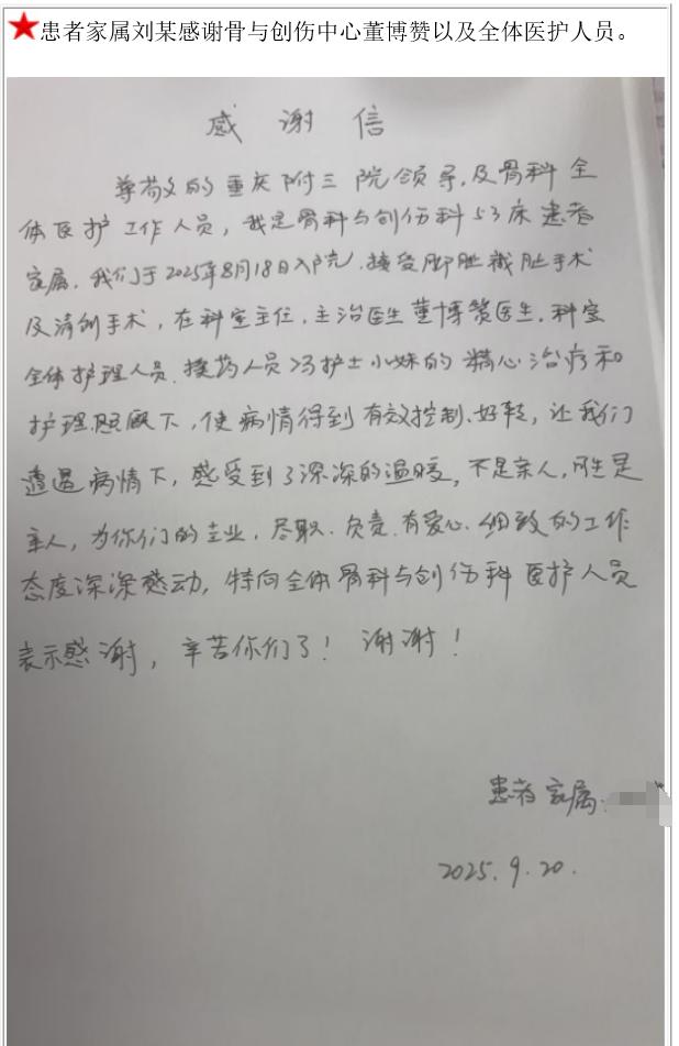患者家属刘某的感谢信。-感谢信-患者心声-患者服务-重庆医科大学附属第三医院【官方网站】