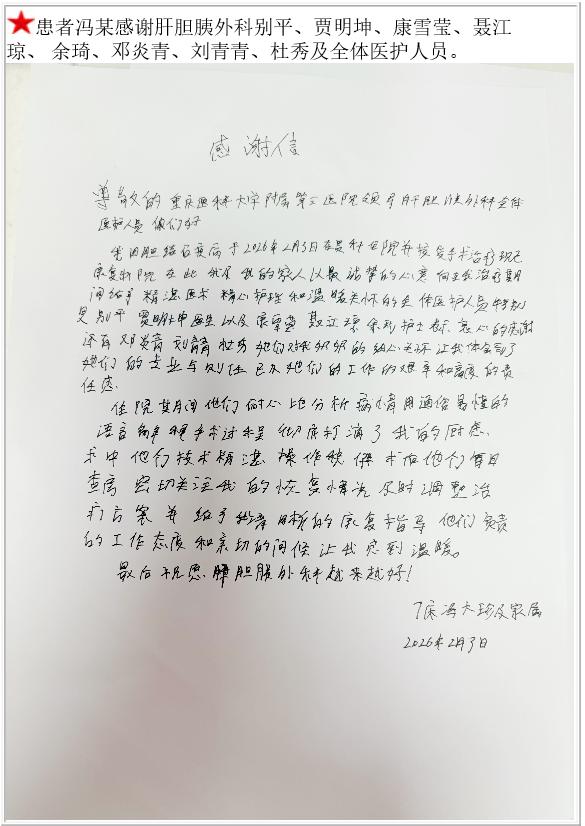患者冯某的感谢信。-感谢信-患者心声-患者服务-重庆医科大学附属第三医院【官方网站】