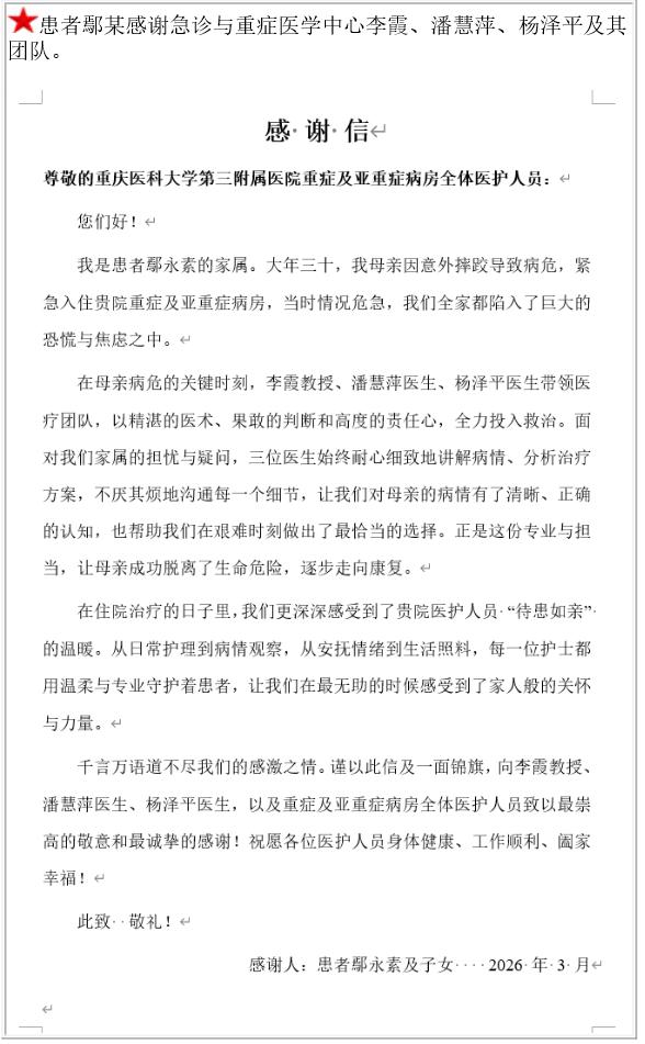 患者鄢某的感谢信。-感谢信-患者心声-患者服务-重庆医科大学附属第三医院【官方网站】