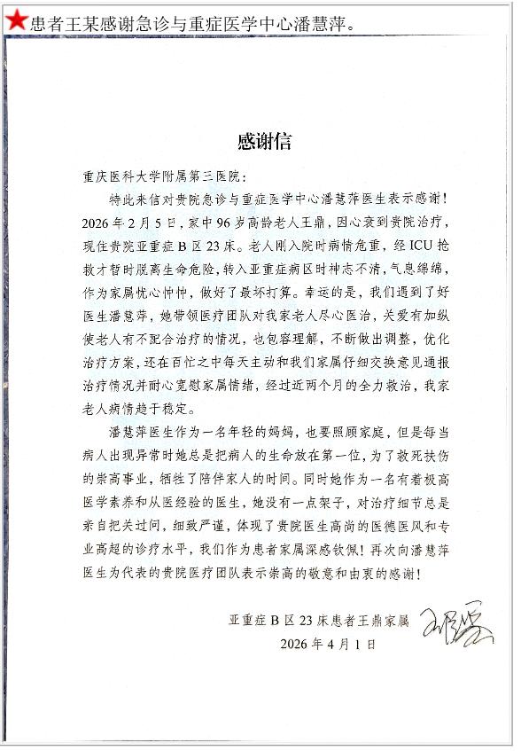 患者王某的感谢信。-感谢信-患者心声-患者服务-重庆医科大学附属第三医院【官方网站】
