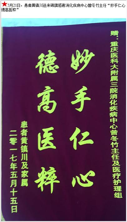 患者黄镇川送来锦旗感谢消化疾病中心曾冬竹主任-锦旗-患者心声-患者服务-重庆医科大学附属第三医院【官方网站】