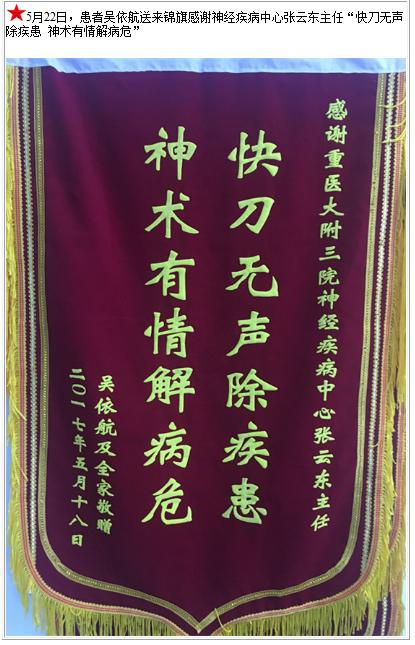 患者吴依航送来锦旗感谢神经疾病中心张云东主任-锦旗-患者心声-患者服务-重庆医科大学附属第三医院【官方网站】