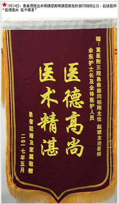 患者屈娅送来锦旗感谢锦旗感谢急救部闫柏刚主任、赵斌医师-锦旗-患者心声-患者服务-重庆医科大学附属第三医院【官方网站】