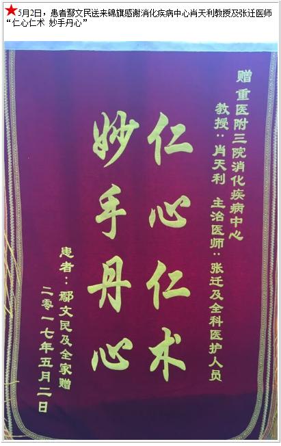 患者鄢文民送来锦旗感谢消化疾病中心肖天利教授及张迁医师-锦旗-患者心声-患者服务-重庆医科大学附属第三医院【官方网站】
