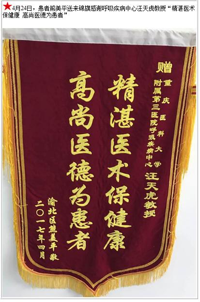 患者熊美平送来锦旗感谢呼吸疾病中心汪天虎教授-锦旗-患者心声-患者服务-重庆医科大学附属第三医院【官方网站】
