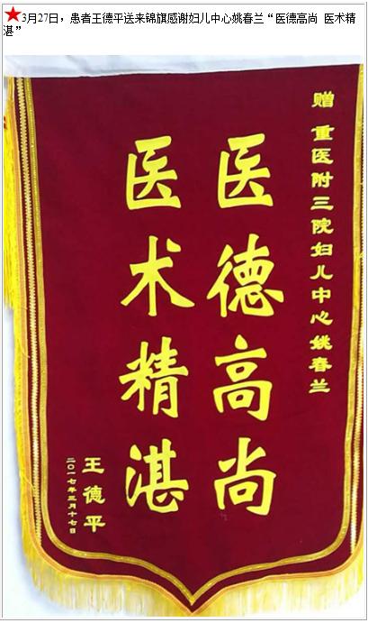 患者王德平送来锦旗感谢妇儿中心姚春兰-锦旗-患者心声-患者服务-重庆医科大学附属第三医院【官方网站】