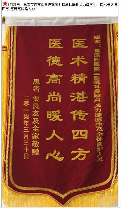 患者贾良友送来锦旗感谢耳鼻咽喉科关力谦医生-锦旗-患者心声-患者服务-重庆医科大学附属第三医院【官方网站】