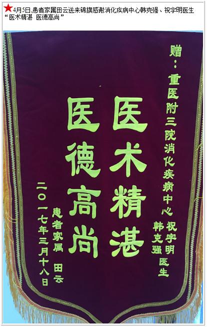 患者家属田云送来锦旗感谢消化疾病中心韩克强、祝宇明医生-锦旗-患者心声-患者服务-重庆医科大学附属第三医院【官方网站】