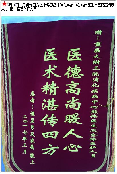 患者谭显秀送来锦旗感谢消化疾病中心熊伟医生-锦旗-患者心声-患者服务-重庆医科大学附属第三医院【官方网站】