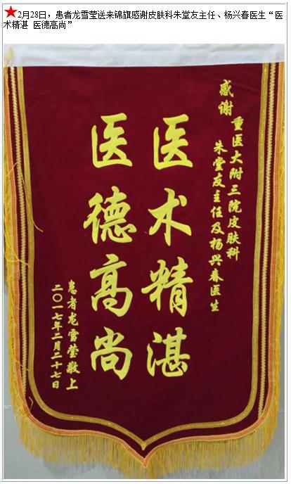 患者龙雪莹送来锦旗感谢皮肤科朱堂友主任、杨兴春医生-锦旗-患者心声-患者服务-重庆医科大学附属第三医院【官方网站】