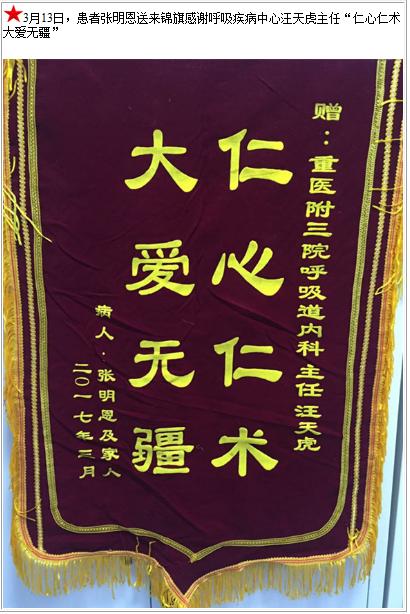 患者张明恩送来锦旗感谢呼吸疾病中心汪天虎主任-锦旗-患者心声-患者服务-重庆医科大学附属第三医院【官方网站】