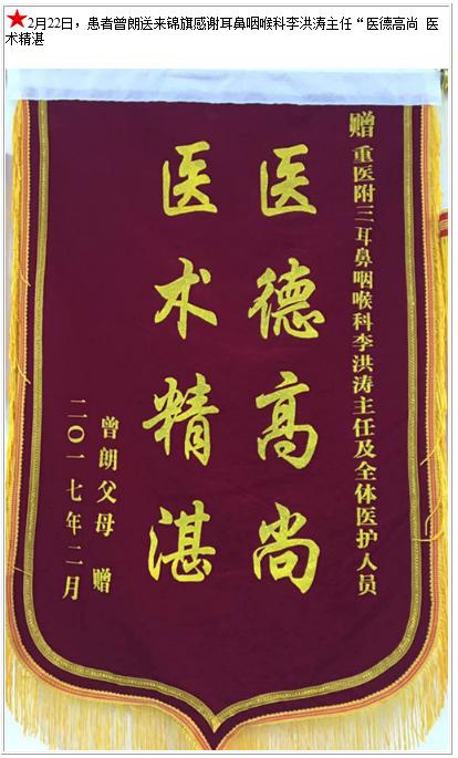 患者曾朗送来锦旗感谢耳鼻咽喉科李洪涛主任-锦旗-患者心声-患者服务-重庆医科大学附属第三医院【官方网站】