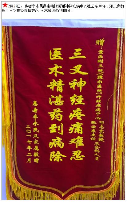 患者李永民送来锦旗感谢神经疾病中心张云东主任、邓志宽教授-锦旗-患者心声-患者服务-重庆医科大学附属第三医院【官方网站】