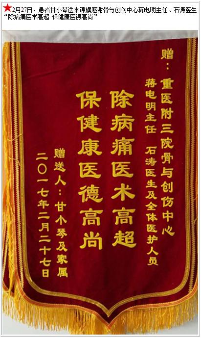 患者甘小琴送来锦旗感谢骨与创伤中心蒋电明主任、石涛医生-锦旗-患者心声-患者服务-重庆医科大学附属第三医院【官方网站】