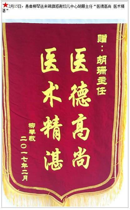 患者柳琴送来锦旗感谢妇儿中心胡珊主任