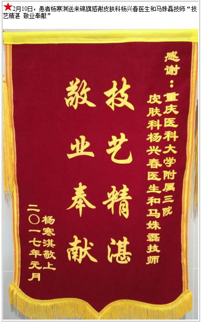 患者杨寒淇送来锦旗感谢皮肤科杨兴春医生和马姝磊技师-锦旗-患者心声-患者服务-重庆医科大学附属第三医院【官方网站】