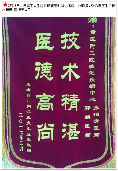 患者王火生送来锦旗感谢消化疾病中心郭鹏、张治清医生-锦旗-患者心声-患者服务-重庆医科大学附属第三医院【官方网站】