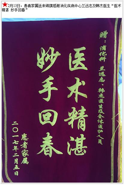 患者家属送来锦旗感谢消化疾病中心兰远志及韩杰医生