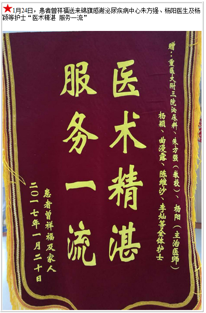 患者曾祥福送来锦旗感谢泌尿疾病中心朱方强、杨阳医生及杨颖等护士-锦旗-患者心声-患者服务-重庆医科大学附属第三医院【官方网站】