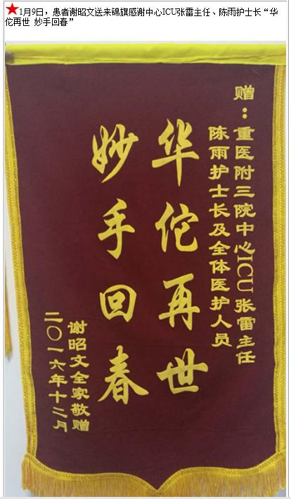 患者谢昭文送来锦旗感谢中心ICU张雷主任、陈雨护士长-锦旗-患者心声-患者服务-重庆医科大学附属第三医院【官方网站】
